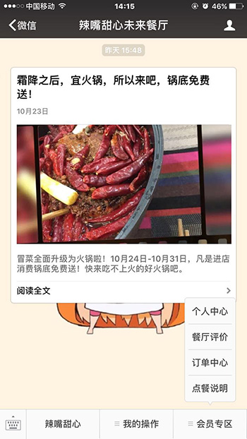 以任意方式关注并进入店面公众号,点击