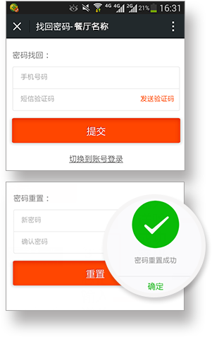 输入手机号码发送验证码,验证成功后,进入“密码重置”页面,输入新密码并确认新密码,点击“重置”。弹出成功提示框,确定即可。